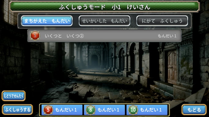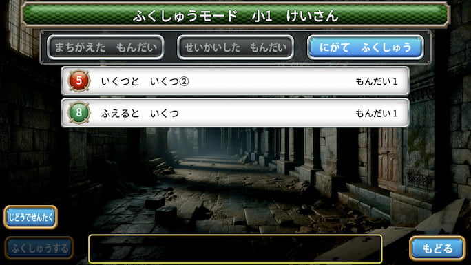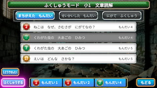 「ふくしゅうモード」では、今までに解いた問題の中から、“間違えた問題”をリスト化。リストの中から問題を選択し復習すると、終了後に復習ポイントがもらえる。集めた復習ポイントでクエストをクリアしていこう!