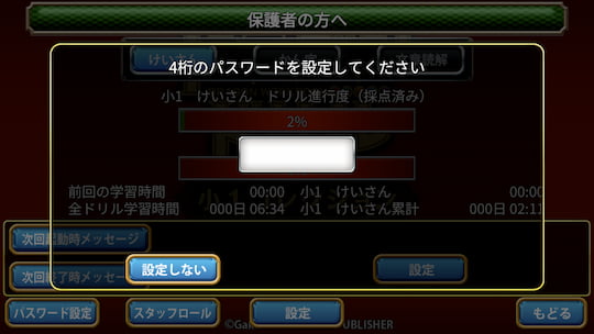 4桁のパスワード設定をすることで子供が「保護者の方へ」の設定を勝手に操作できなくすることができます。