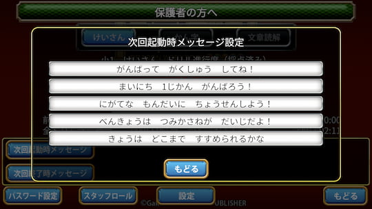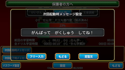 ドリル起動時と終了時にお子さまに応援メッセージをおくることができます。
