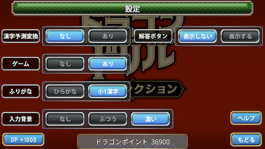 ゲーム中の文字は「ひらがな」だけか、該当学年の「漢字」アリを選ぶことができます。