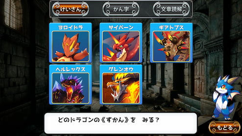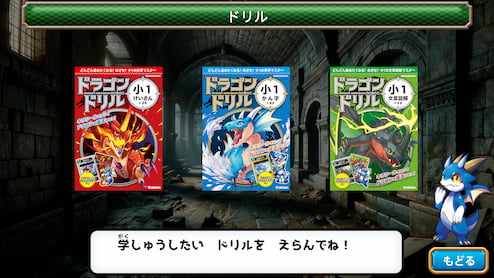 ドラゴン復活が⽬的のクエストは、ゲームならではのロールプレイングゲーム形式で進⾏。ゲーム中には数多くのドラゴンが登場し、バトルや育成、図鑑への登録が楽しめる。ただしプレイするためには「ドリルで勉強する」ことが必要なため毎⽇勉強する意欲を掻き⽴てられる。