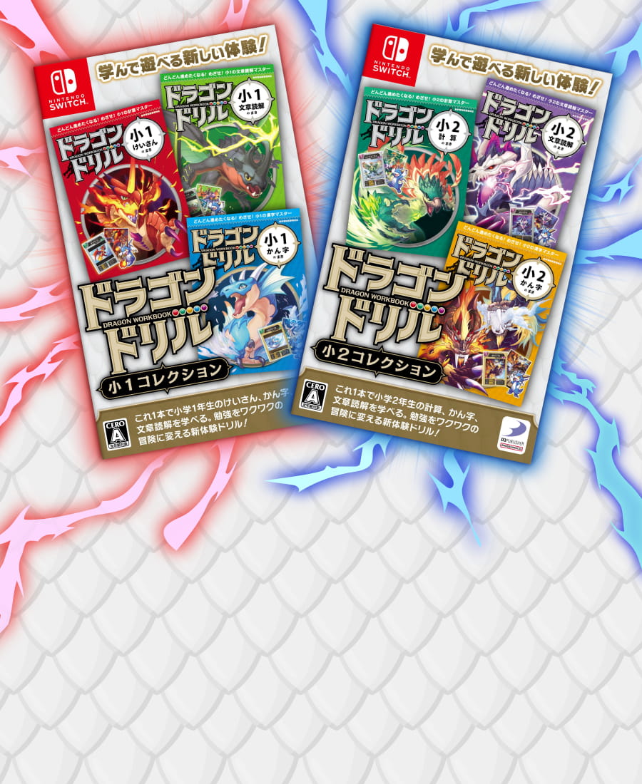 遊んで学べる“ドラゴンドリル(Gakken刊)がNintendo Switch™に登場! ゲームならではの演出で、ドラゴンたちの迫⼒のバトルシーンを堪能!問題をクリアする毎にもらえるシールを集めてダークドラゴンにされたドラゴンを復活させ、バトルや育成、図鑑登録など勉強しながらゲームを楽しむことができます。遊びの要素だけじゃなく「ふくしゅうモード」で苦⼿な問題を克服できたり、保護者がドリルの内容を管理できる「保護者設定」を収録するなど、しっかり学⼒を⾝につけられる要素も満載!