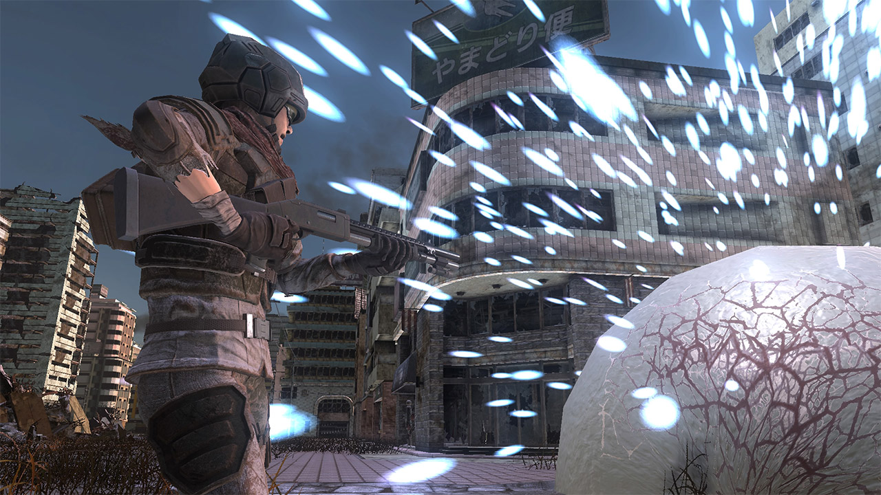 In 2017, an unidentified flying object flies over Tokyo and launches an indiscriminate attack. Overwhelming technology and vast numbers of giant creatures attacks the Earth. Humanity is once again in danger of extinction. The first Xbox 360 version was also the first full-price title in the series. With a completely new world setting, the title focuses on the story of the Forliners. This was the first version to imploy HD graphics which intensified the battles with giant creatures. Although the only playable soldier class was the Soldier, many NPCs were added to the game allowing for squads. The military feel of the game was increased with fighting in numbers.