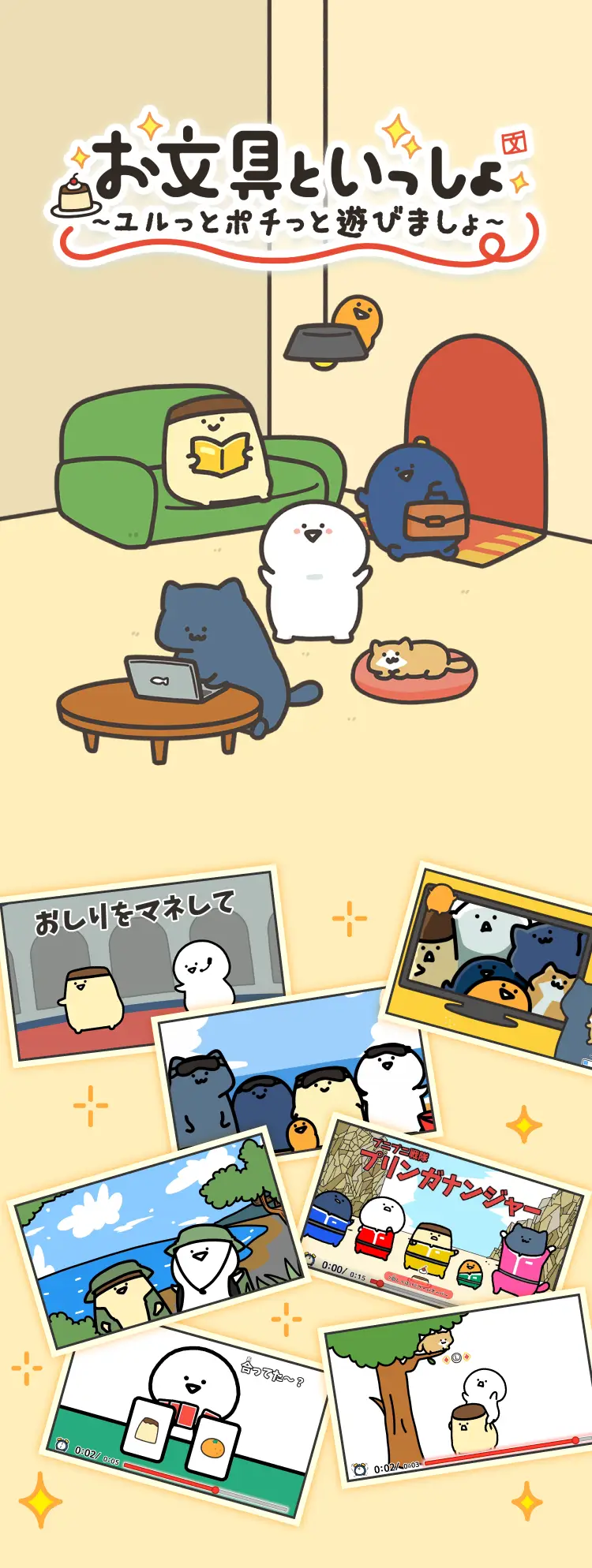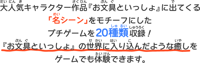 大人気キャラクター作品『お文具といっしょ』に出てくる「名シーン」をモチーフにしたプチゲームを20種類収録!『お文具といっしょ』の世界に入り込んだような癒しをゲームでも体験できます。