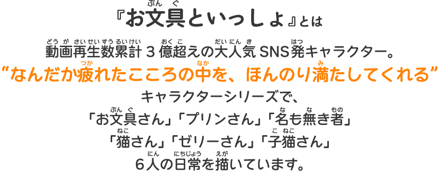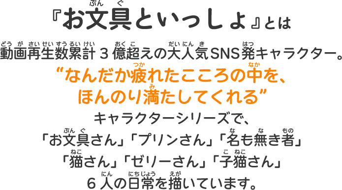 『お文具といっしょ』とは動画再生数累計3億超えの大人気SNS発キャラクター。“なんだか疲れたこころの中を、ほんのり満たしてくれる”キャラクターシリーズで、「お文具さん」「プリンさん」「名も無き者」「猫さん」「ゼリーさん」「子猫さん」6人の日常を描いています。『お文具といっしょ』とは動画再生数累計3億超えの大人気SNS発キャラクター。“なんだか疲れたこころの中を、ほんのり満たしてくれる”キャラクターシリーズで、「お文具さん」「プリンさん」「名も無き者」「猫さん」「ゼリーさん」「子猫さん」6人の日常を描いています。