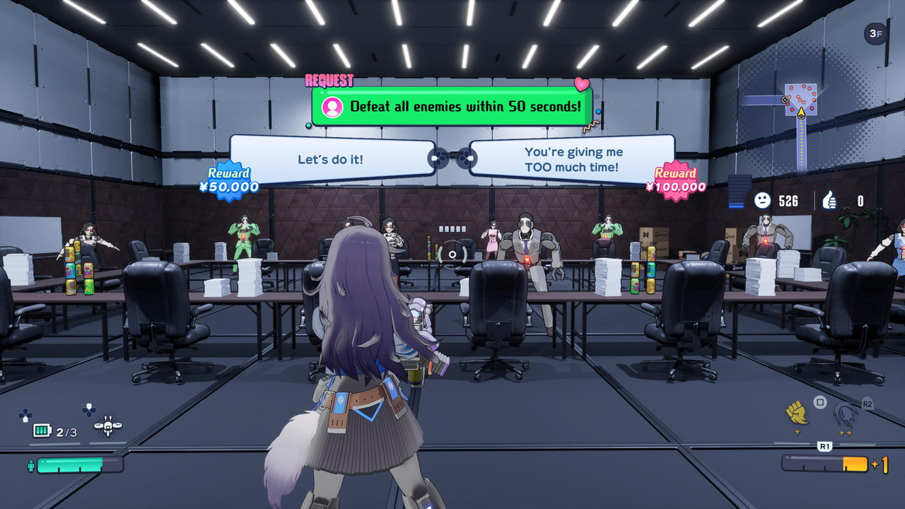 The battlefield is a 100-story skyscraper. Standing in your way are cyborg corporate soldiers known as the “Working Dead.” At the top floor, the evil CEO awaits. Each floor changes every time you enter, and the security system is like a trap. If the Machine Girl is defeated along the way, you'll have to start over from the first floor. Control the limited space and fight your way to the top floor.