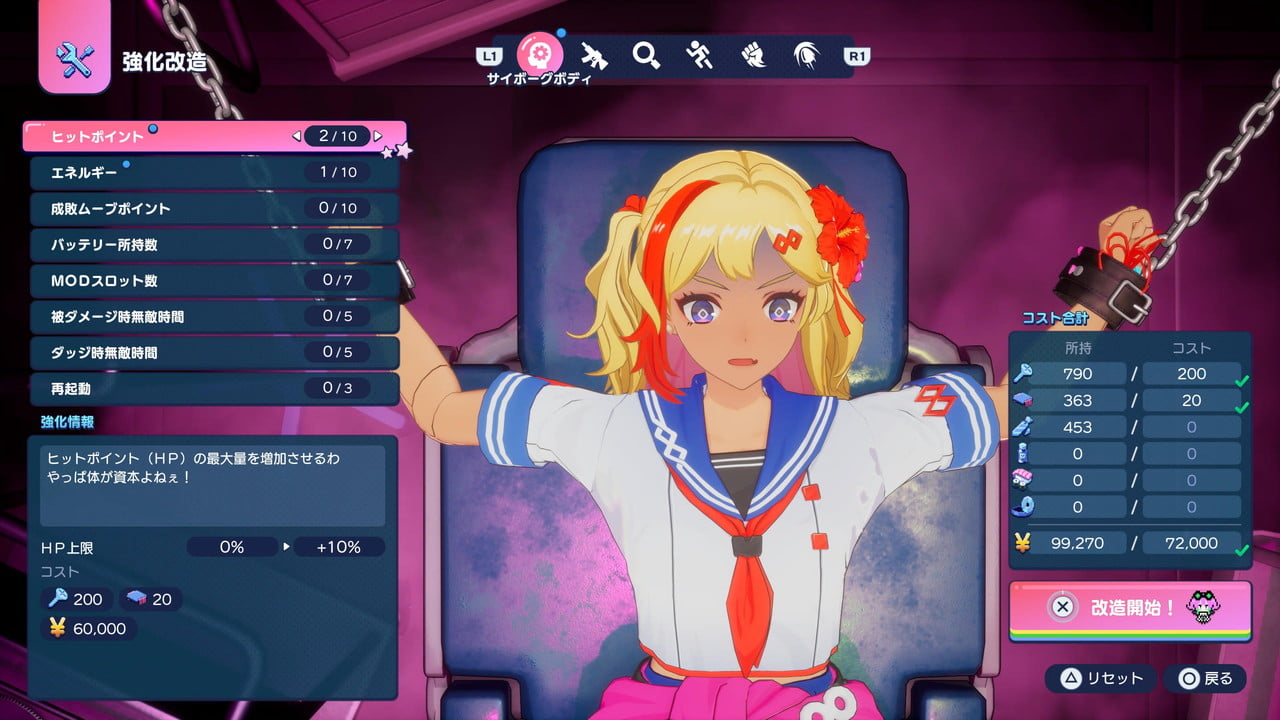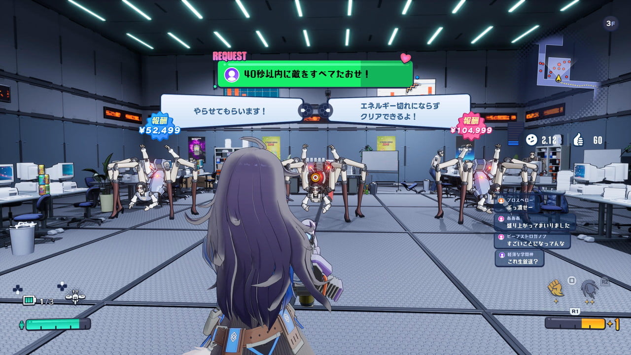 戦闘中にアイテムBOXから得た武器や強化プログラム「MOD」は即座に装備して使用可能。しかし撃退されるなど再出撃の際は全てを失う。一方、敵を撃破して得られる素材やLIVE配信の「投げ銭」は継続され、後の改造や能力強化に活用できる。どちらも最上階到達に必要不可欠な収集要素だ。