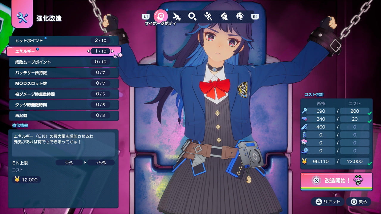戦闘やLIVE配信で手に入れた素材と資金を使ってマシンガールを強化・改造できる。強化可能な要素はさまざまで、新たな能力を装備したり、既存の能力を向上させることが可能。マシンガールの開発者「葉加瀬博士」がゴリゴリっと改造するぞ。安心してその身をゆだねよう。